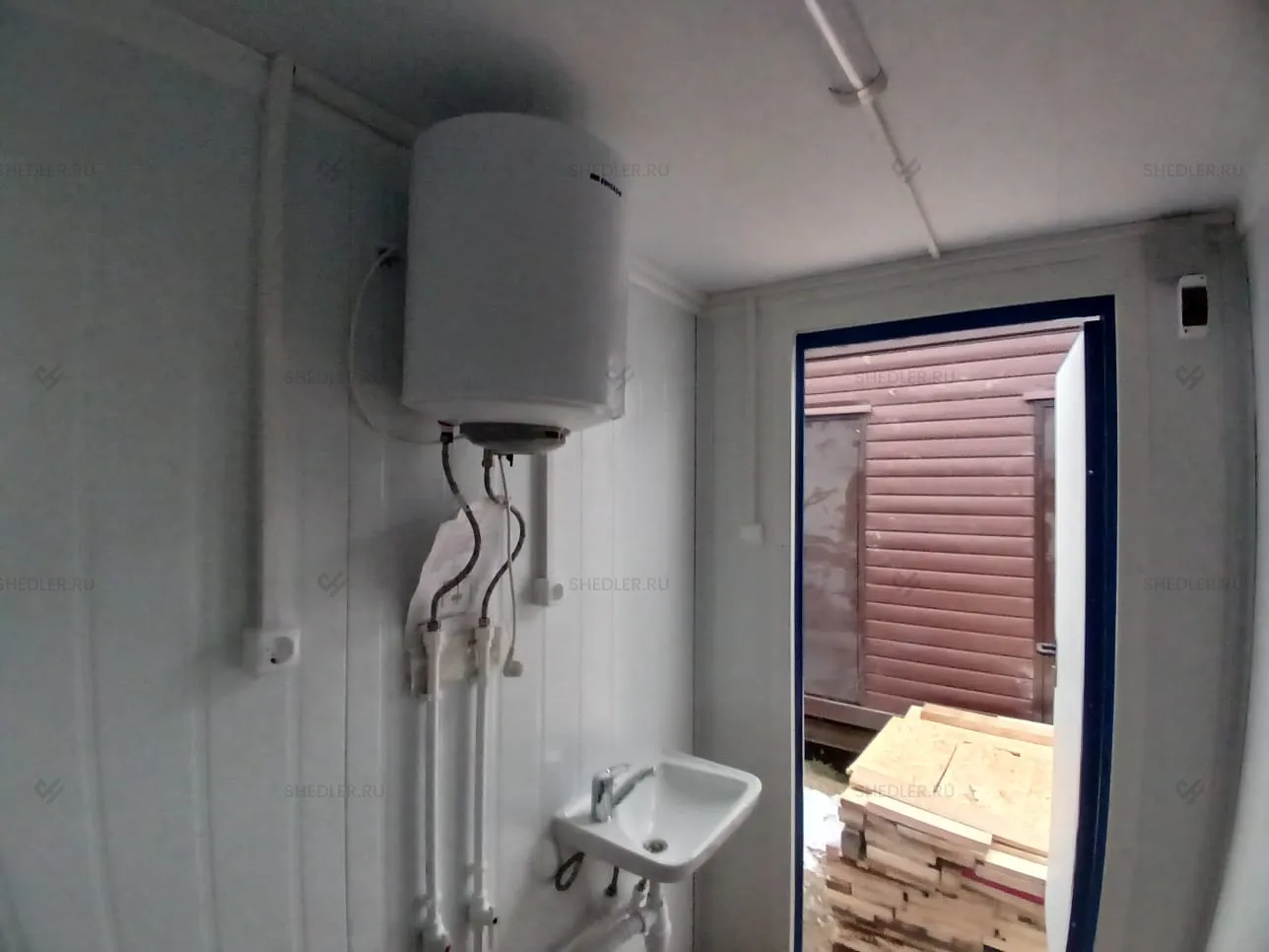 Быстровозводимый модуль имеет все необходимое для комфортной эксплуатации: электропроводку на 5 кВт со светодиодным освещением и автоматическим выключателем на 25А. Горячее водоснабжение обеспечивает бойлер на 30 л, а комфортную температуру воздуха – 2 конвектора. В базовой комплектации также предусмотрено по 2 раковины и унитаза.