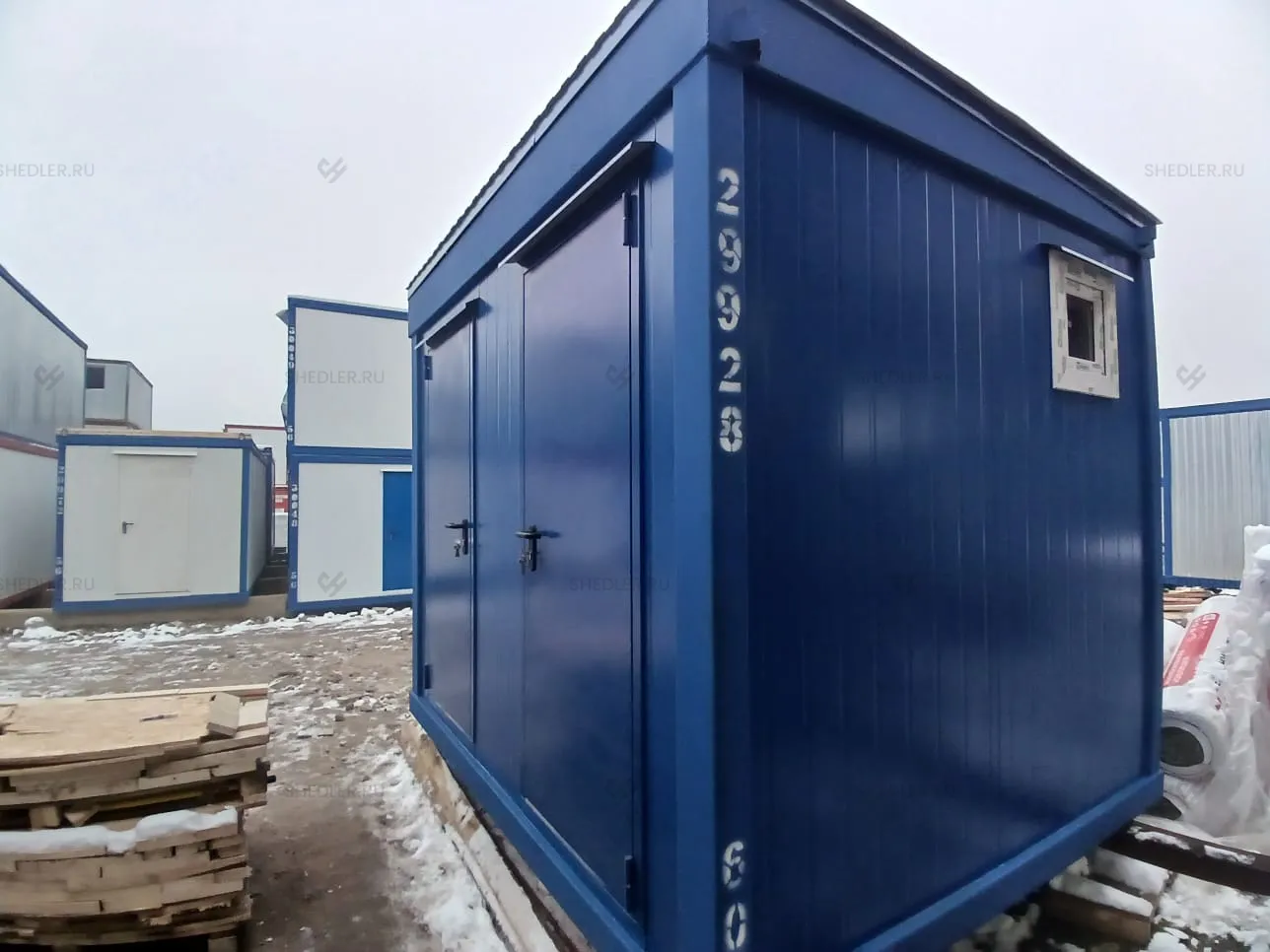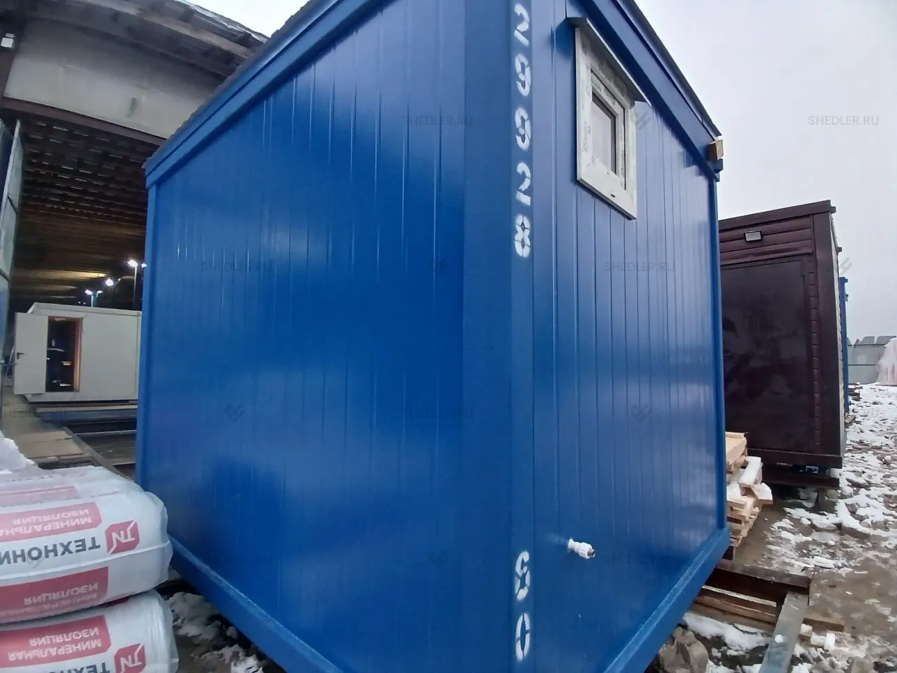 Фасадная часть состоит из трехслойных сэндвич-панелей Rockwool 100 мм с полимерным покрытием в палитре RAL 5005. Материал обладает высокой жесткостью и низкой теплопроводностью. Для еще большего увеличения энергоэффективности пол и потолок утеплены негорючей базальтовой ватой УРСА ТЕРРА 100 мм и паронепроницаемой мембраной Гидропрф В. Современное остекление и входные группы также сводят теплопотери к минимуму, такой результат обеспечивает утепленная, входная металлическая дверь российского производства с порошковым окрашиванием РАЛ 5005- 2 и 2 ПВХ-окна 0,5 х 0,5 м.