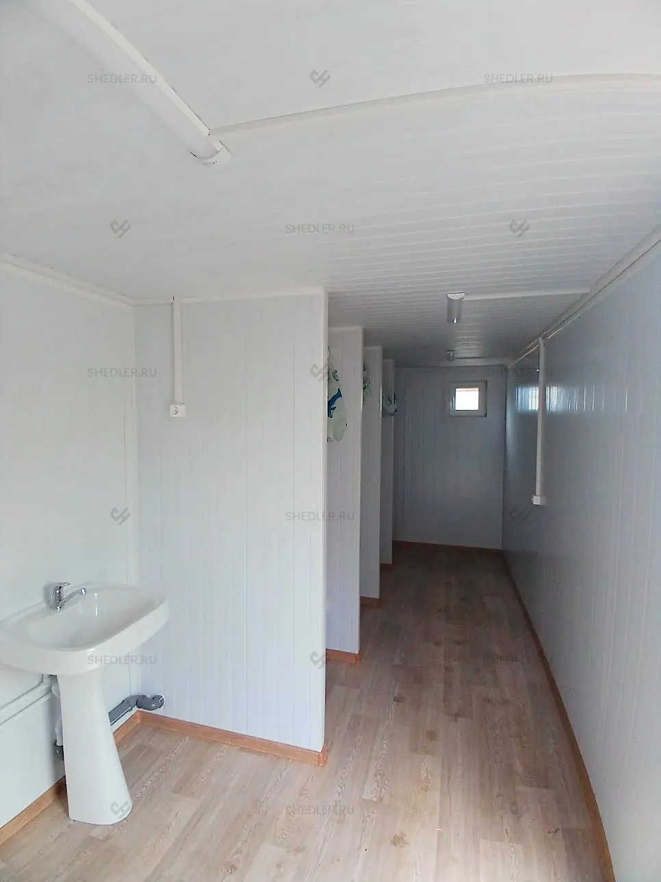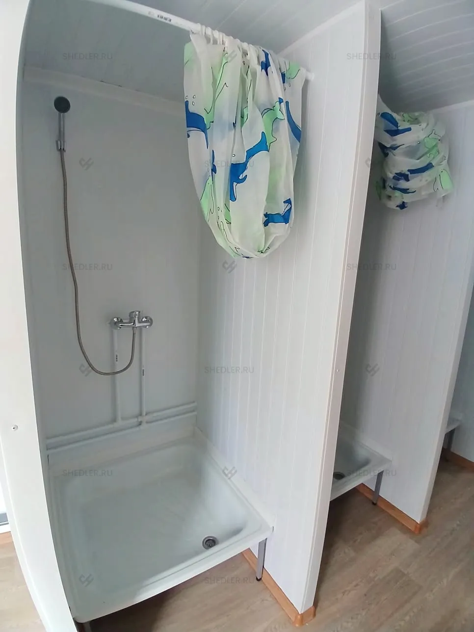 Контейнер собран на заводе, включая все коммуникации и отделку, доставлен силами нашей компании и установлен на площадке на опорные точки. Благодаря четким техническим решениям и продуманной комплектации клиент получает функциональную душевую, готовую к эксплуатации «под ключ», без доработок.