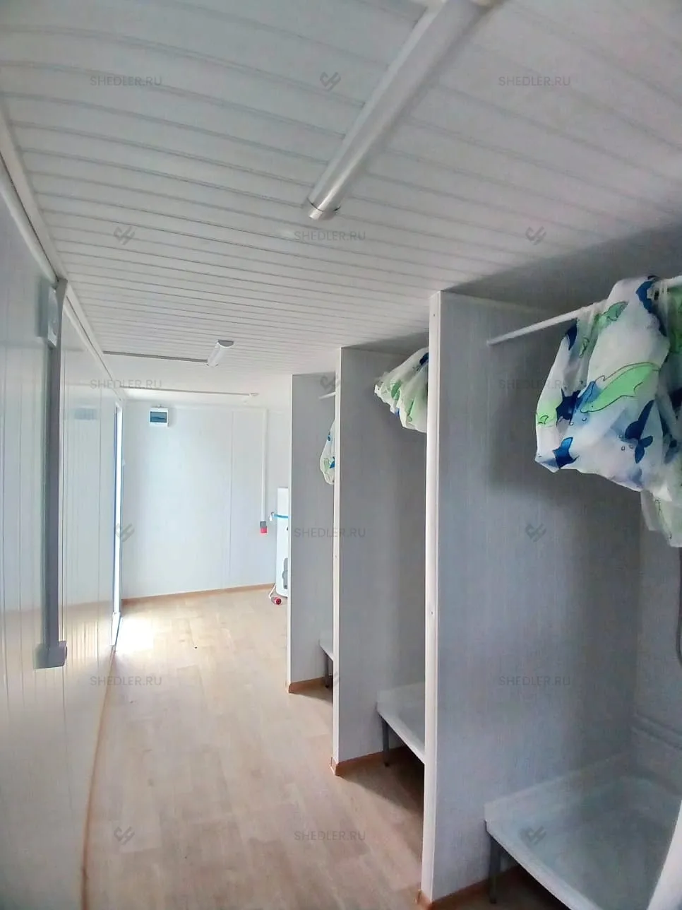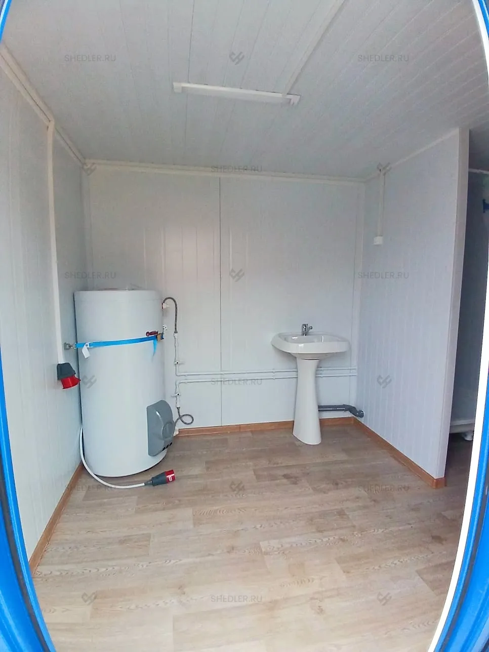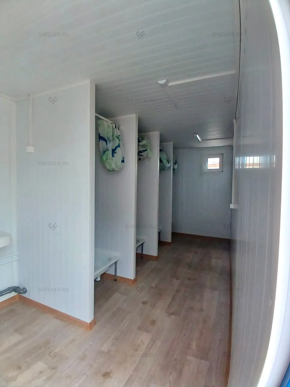 Внутри предусмотрены три душевые кабины с поддонами, смесителями и шторками, отделенные перегородками. У каждого бойлера – два водонагревателя по 100 л. Электропроводка выполнена в скрытых кабель‑каналах «Евро», мощностью усилена до 7 кВт, установлено УЗО, люминесцентные светильники, заземленные розетки, выключатели и автоматический рубильник на 25 А. Врезной шаровой кран из ПВХ позволяет легко перекрыть подачу воды.