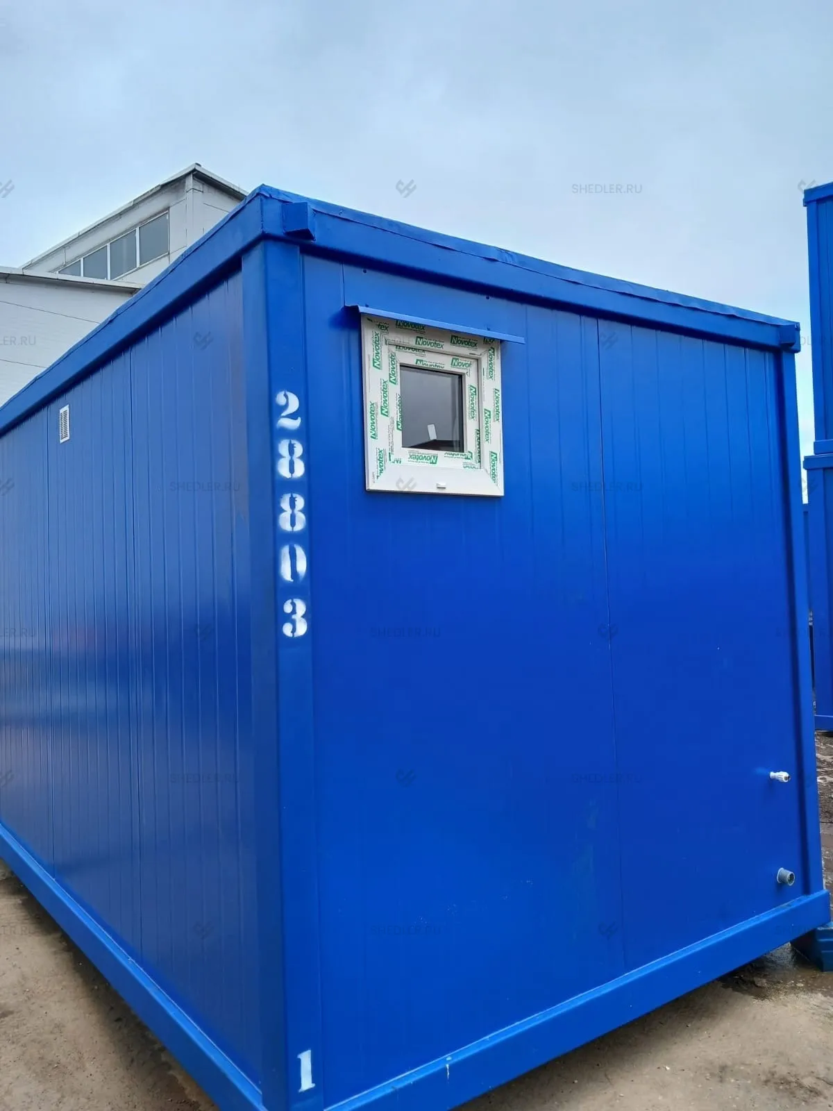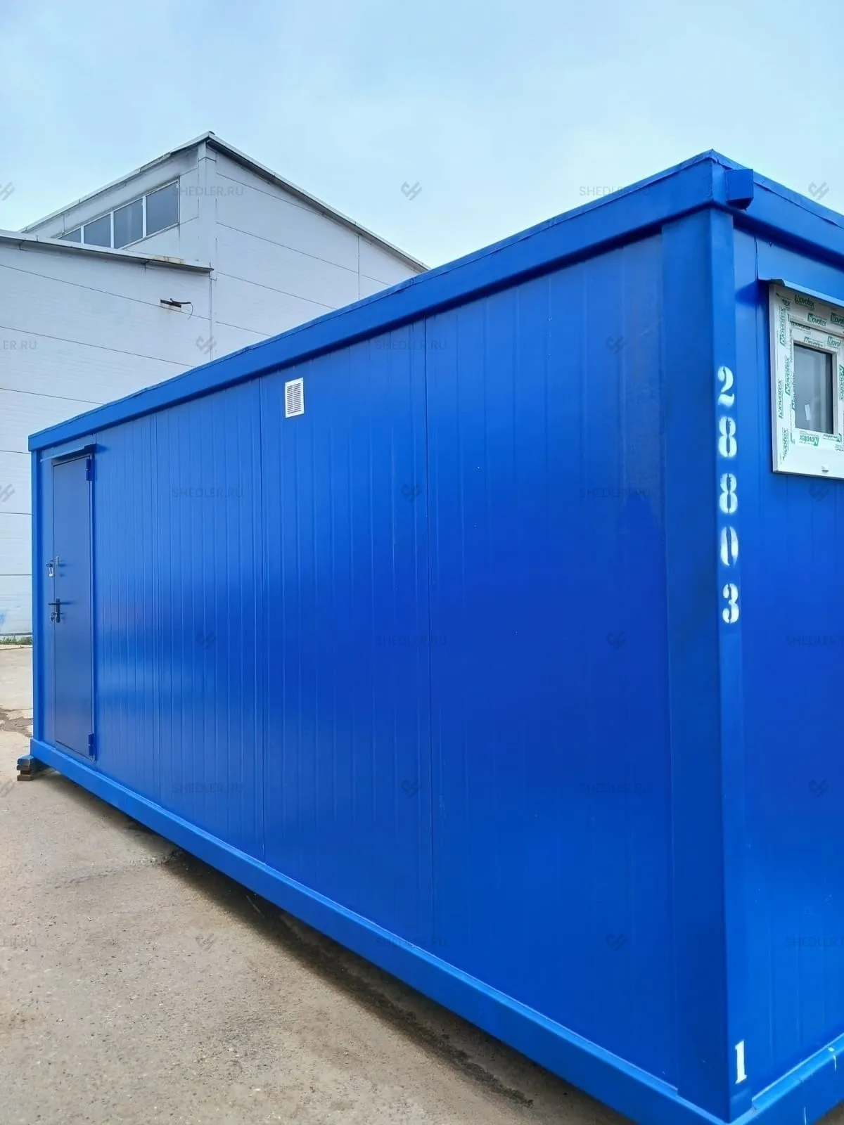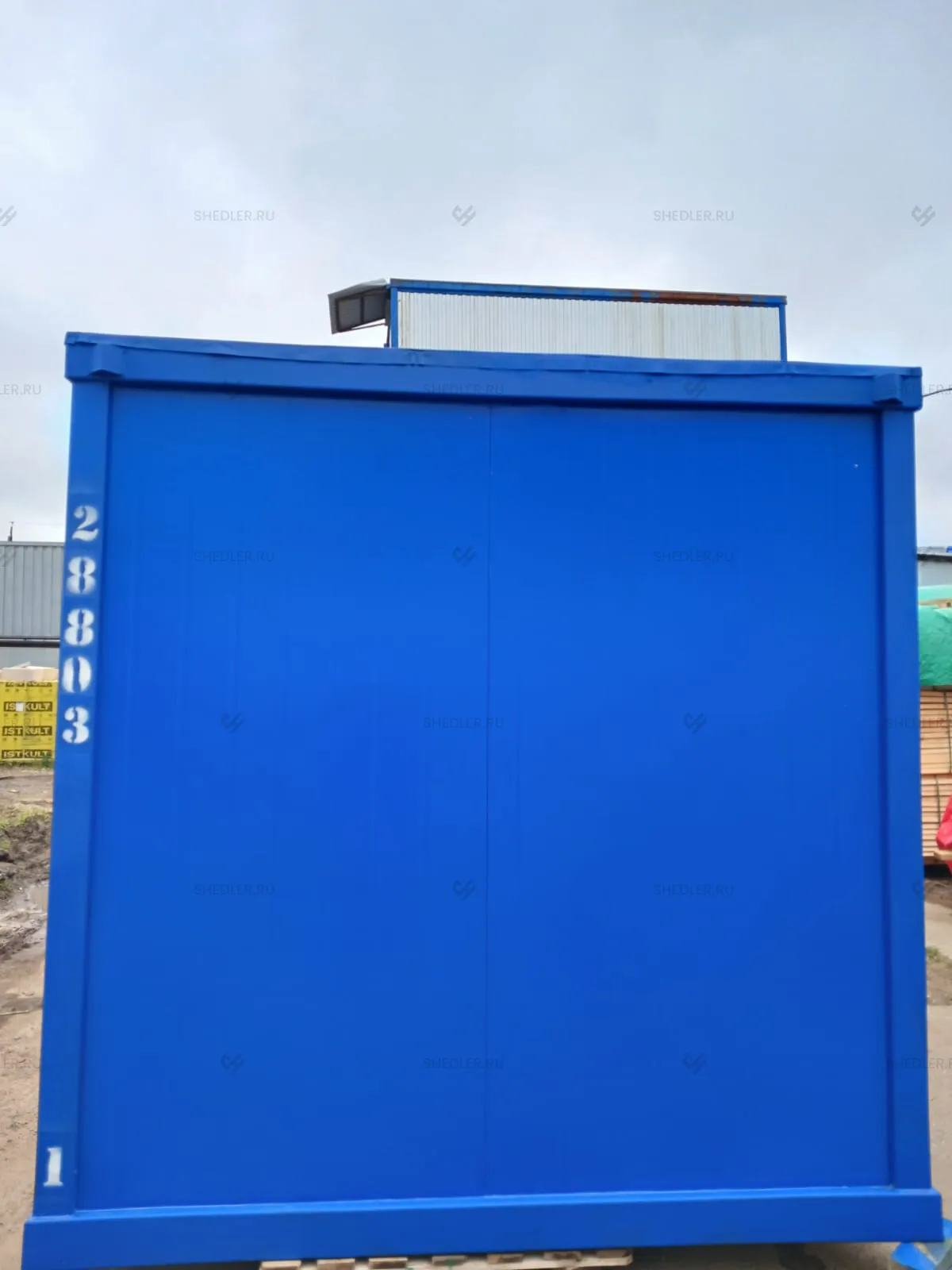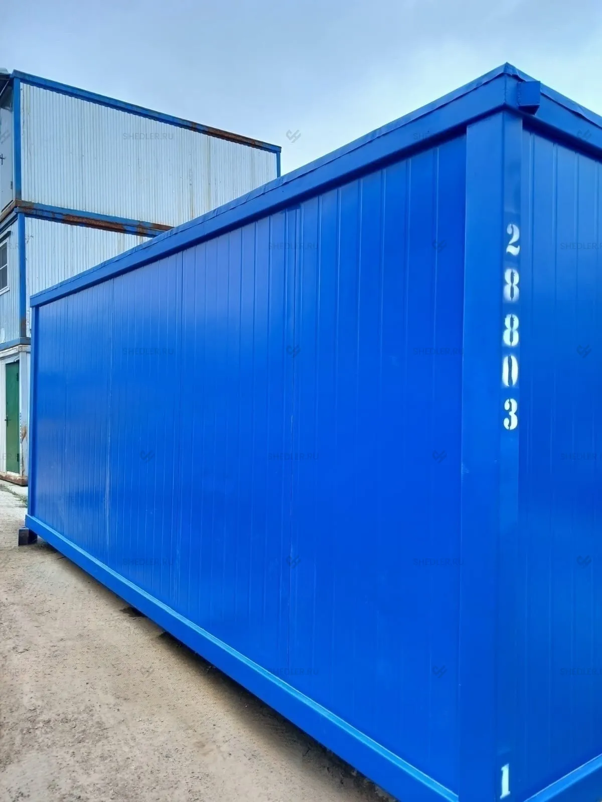 Каркас из швеллера 120 мм и уголка 90 мм, окрашенных в синий, деревянная обрешётка 100 × 40 мм, с паро‑ и гидроизоляцией. Для защиты от внешней среды использован оцинкованный профлист С‑8 – на стенах, дне и крыше (0,7 мм). Модуль устойчив к осадкам и механическим нагрузкам.