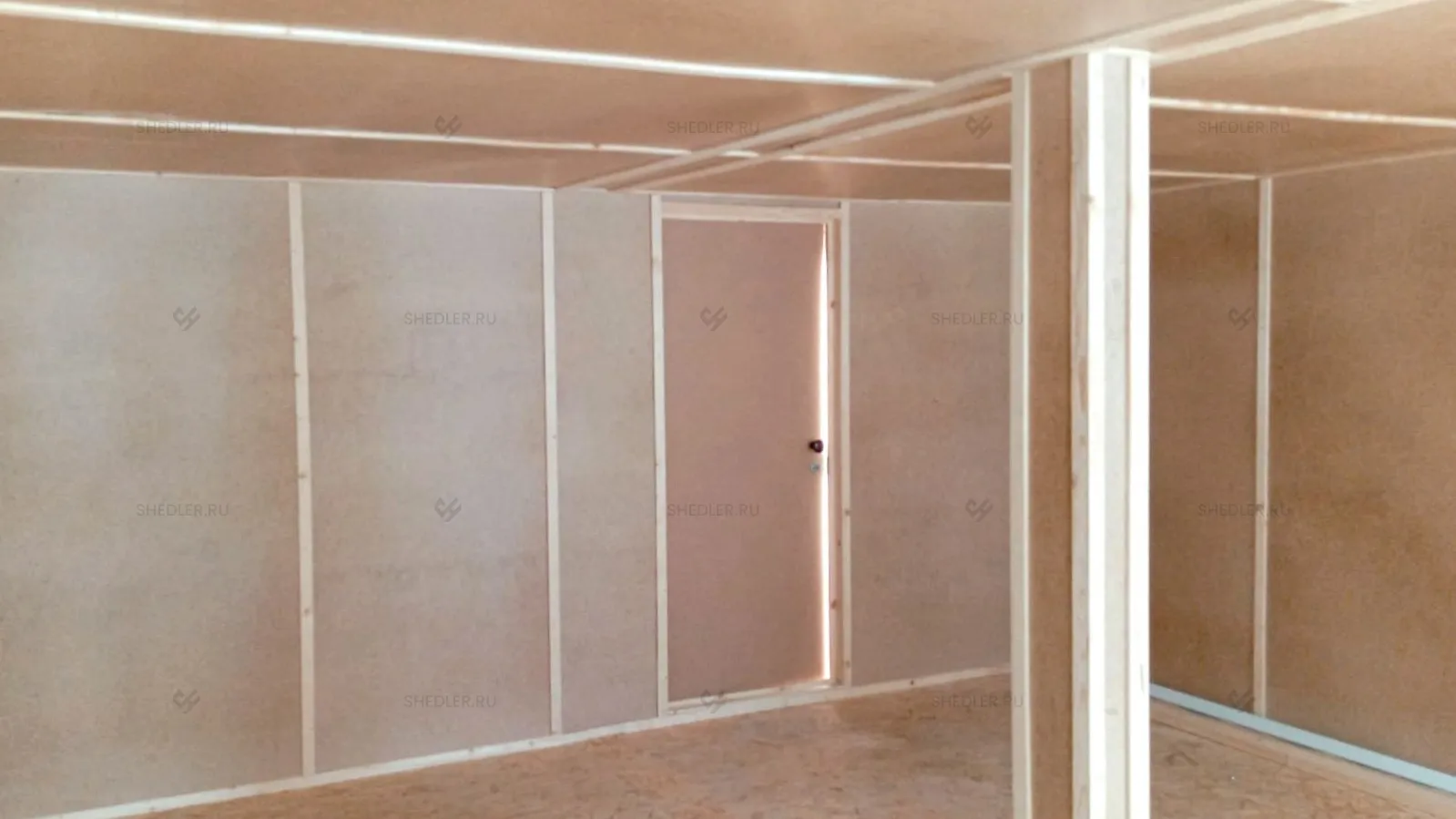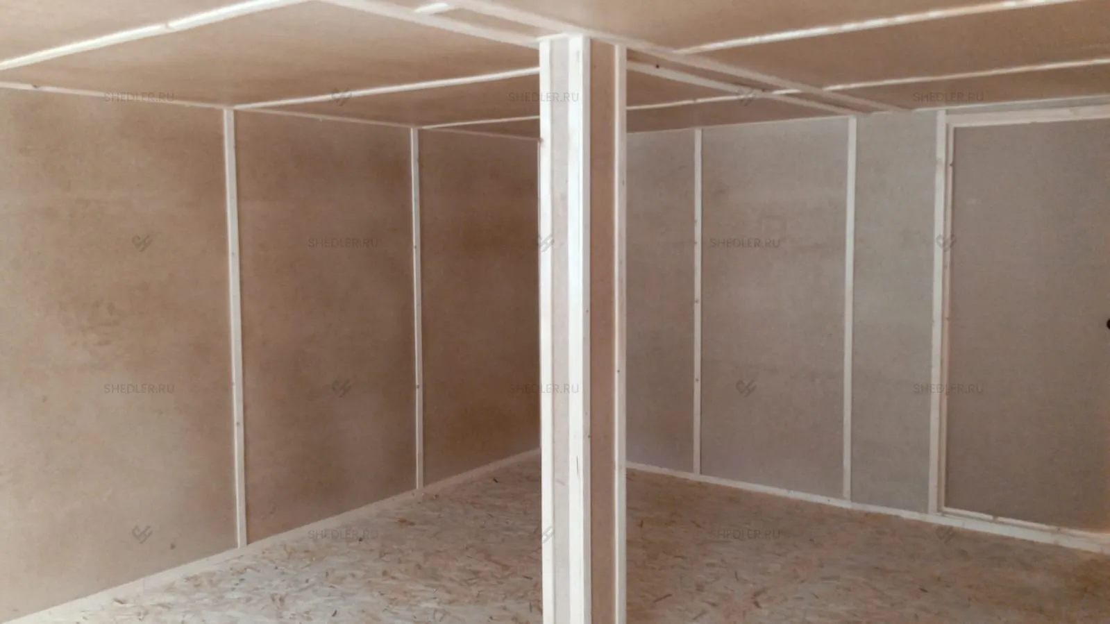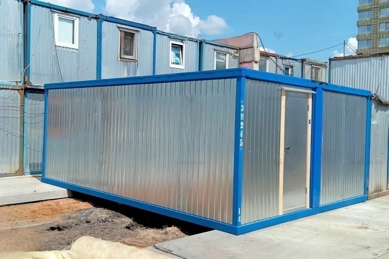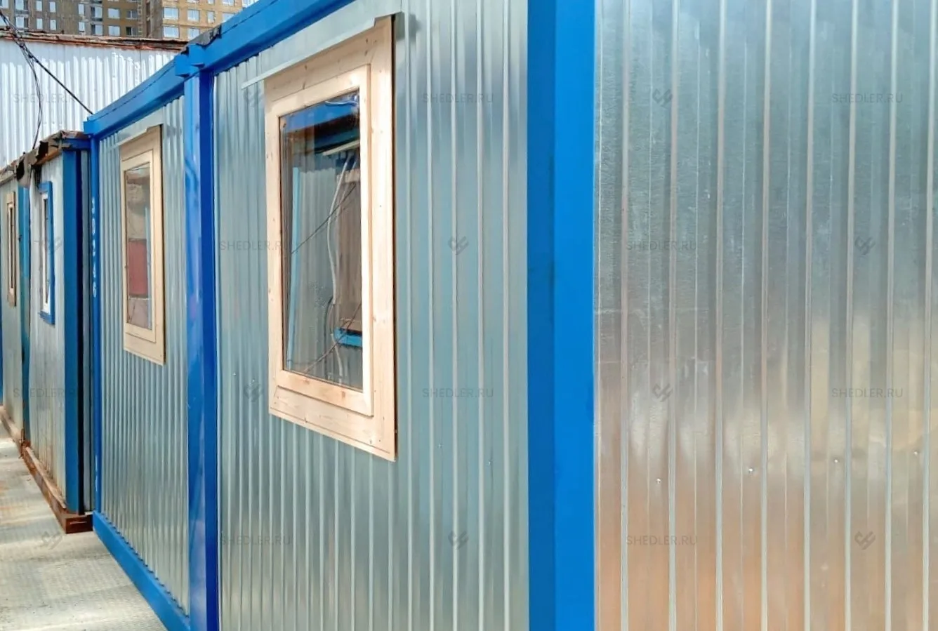 Каркас здания выполнен из металлического швеллера и уголков 90 х 90 мм синего цвета. Крыша была выбрана плоская сварная из стального листа толщиной 0,7 мм, окрашенная в цвет каркаса. Дно и наружная отделка выполнены из оцинкованного профлиста С8. Внутреннюю отделку стен и потолков сделали из ДВП.