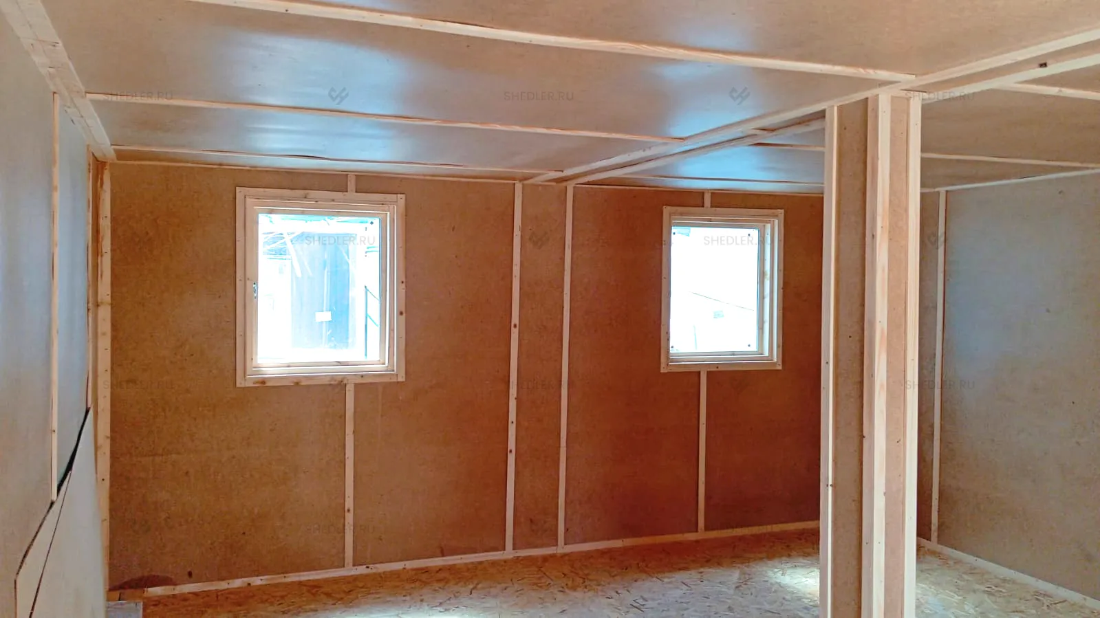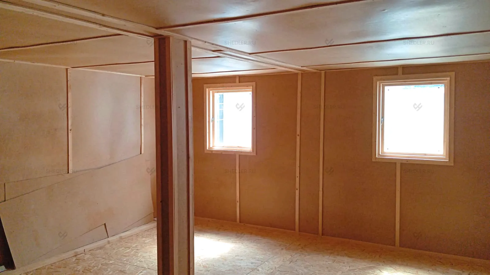 Дополнили конструкцию входной дверью из ДВП, обшитой снаружи гладким оцинкованным листом, и двумя деревянными окнами размером 75 х 90 см с двойным остеклением.