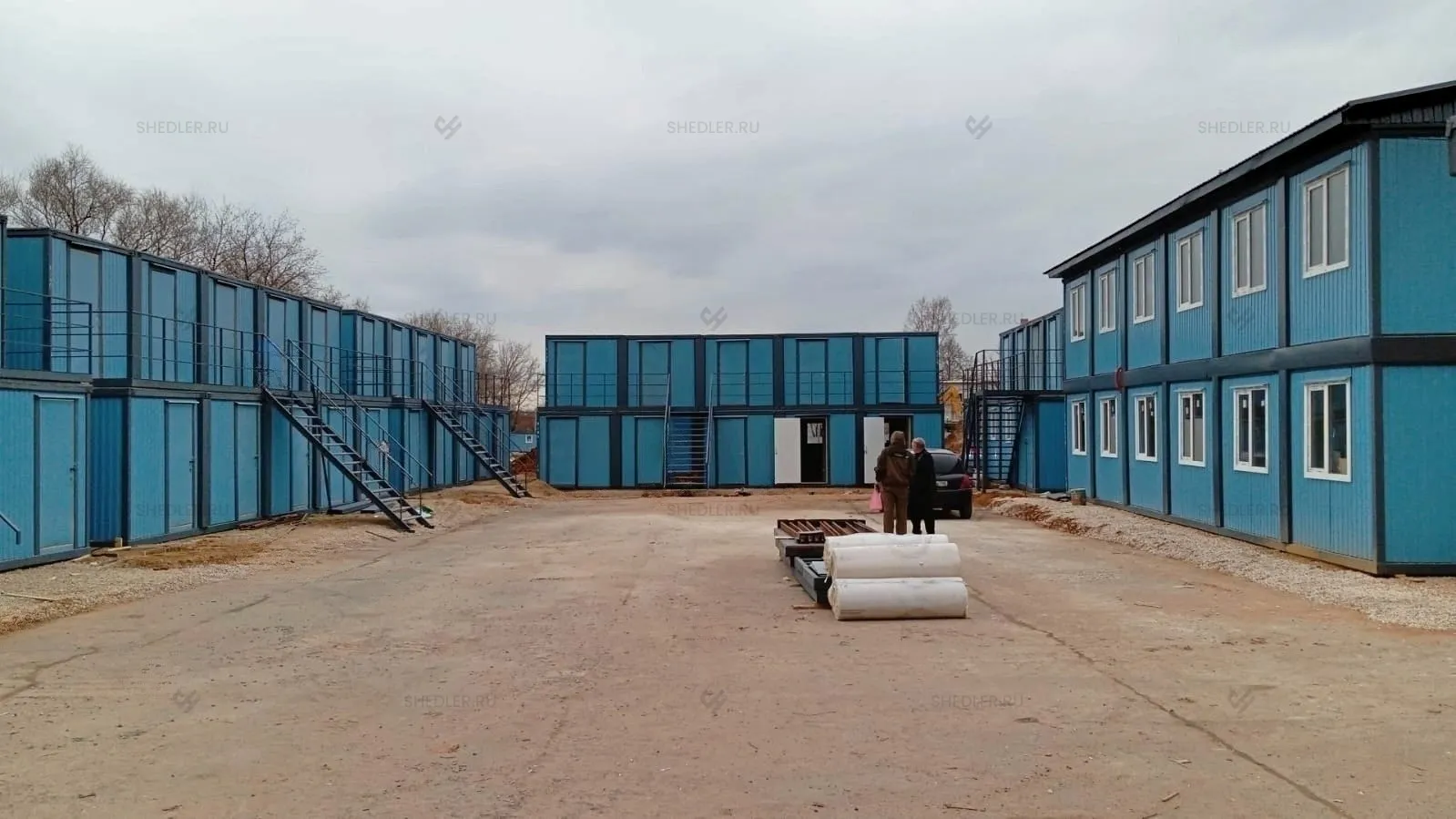 В строительный городок входит сразу несколько разноплановых зданий, выполненных на базе блок-контейнеров БК-00. Площадка была разделена на несколько секций, которые удобно дополняют друг друга.