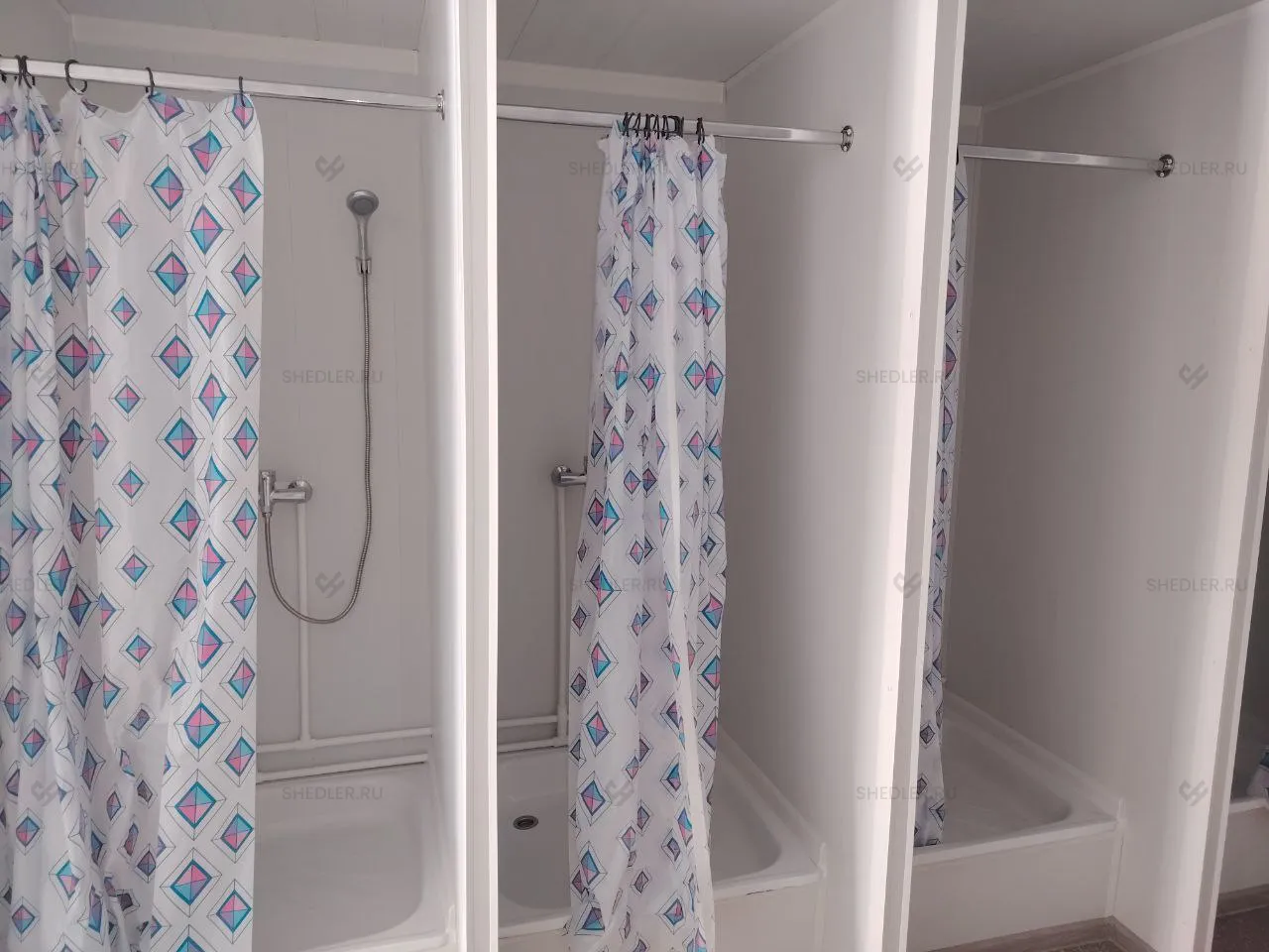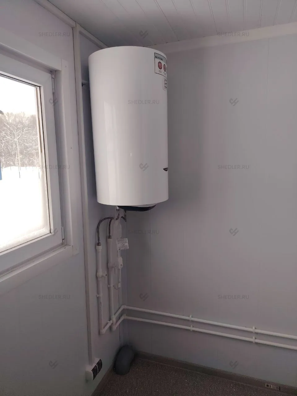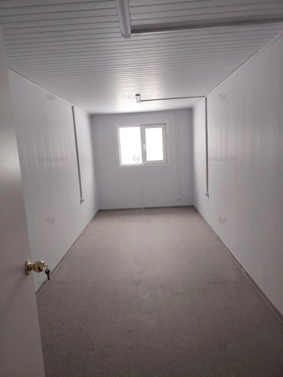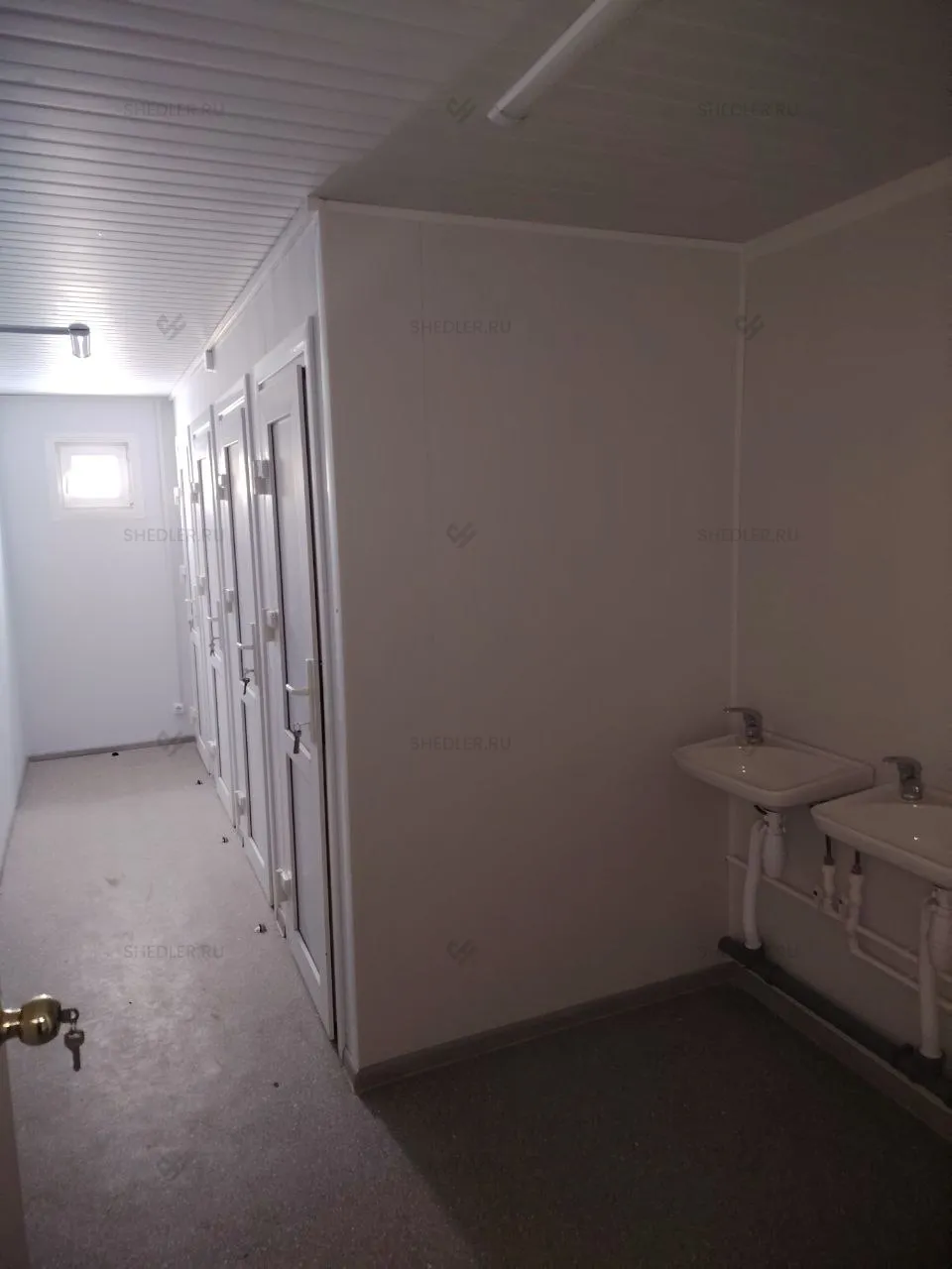 Внутреннее пространство разделено каркасно-щитовыми перегородками с ПВХ-облицовкой. На полу из ОСБ 18 мм уложен линолеум, потолок отделан белыми ПВХ-панелями, а стены – сэндвич-панелями Rockwool.