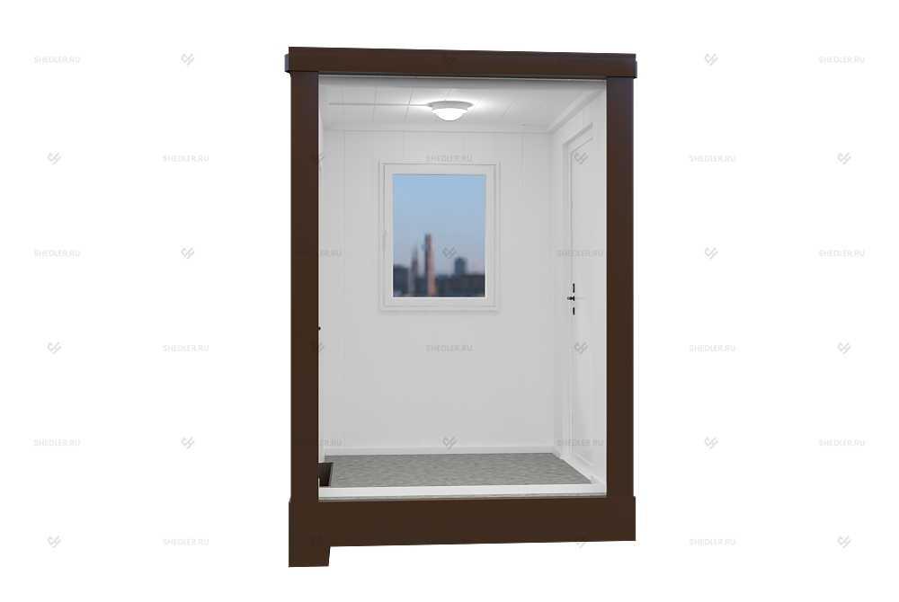 В базовом исполнении есть 2 утепленных входных двери и 2 пластиковых окна 80 x 100 см с поворотно-откидным открыванием. Европроводка с фурнитурой и светодиодным освещением обеспечивает высокий уровень комфорта при эксплуатации модуля, а автоматический выключатель – безопасность внутренней электросети. За счет допкомплектации адаптируем проект под потребности заказчика.