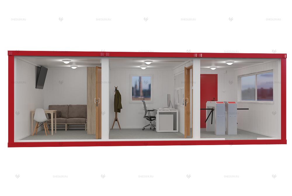 По проекту одноэтажный блок-модуль размером 7,35 x 4,0 x 2,45 м имеет площадь 29,4 кв.м, которая разделена на отдельные зоны. Организованное перемещение между ними организовано при помощи 2 МДФ-дверей и турникета с контролем доступа.