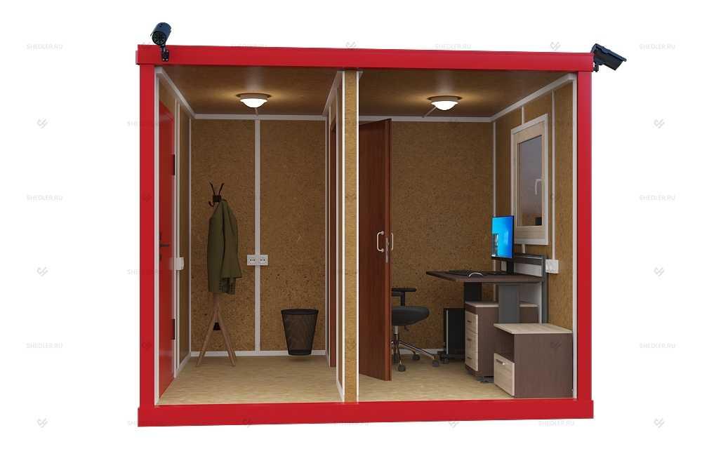 В конструкции предусмотрена входная и внутренняя дверь, двухкамерное окно 0,9Х0,9 м. Поворотно-откидная система отпирания окна, позволяет переводить его в режим проветривания, не занимая внутреннее пространство открытой створкой, москитная сетка защитит от проникновения насекомых.