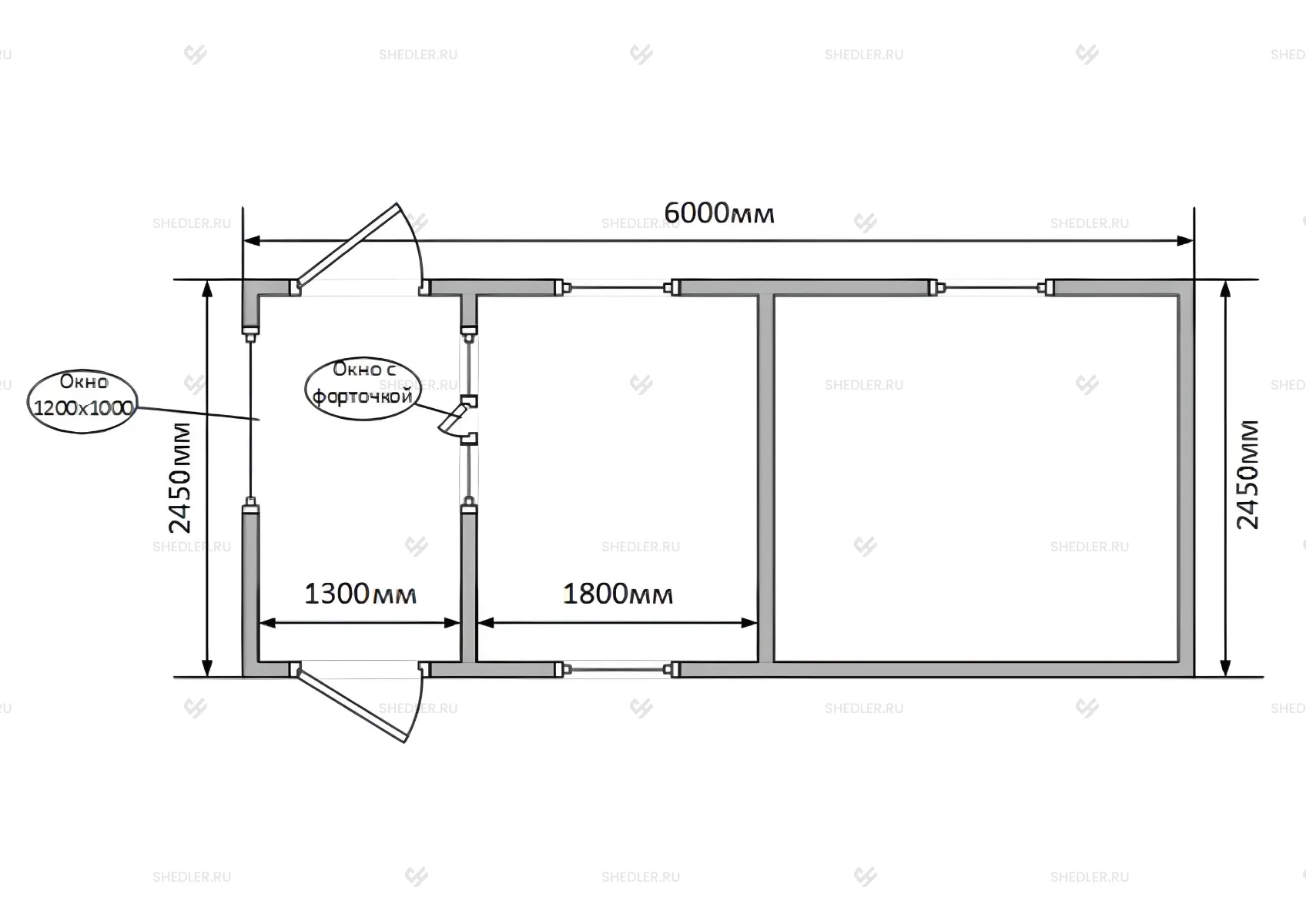 Дополнительно постройка оборудована двумя входными дверями (основной и дополнительной) из МФД с врезным замком, двумя межкомнатными дверями из МФД, глухим ПВХ окном размером 1,2 х 1 м, тремя ПВХ поворотными окнами размером 0,8 x 1 м и ПВХ окном с форточкой размером 1,2 x 1 м.