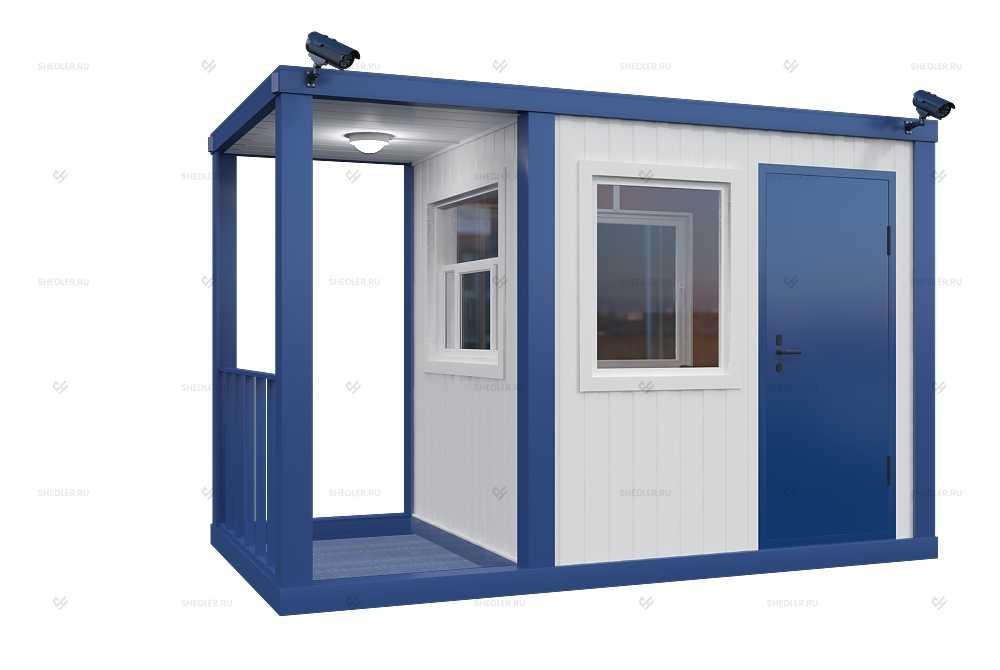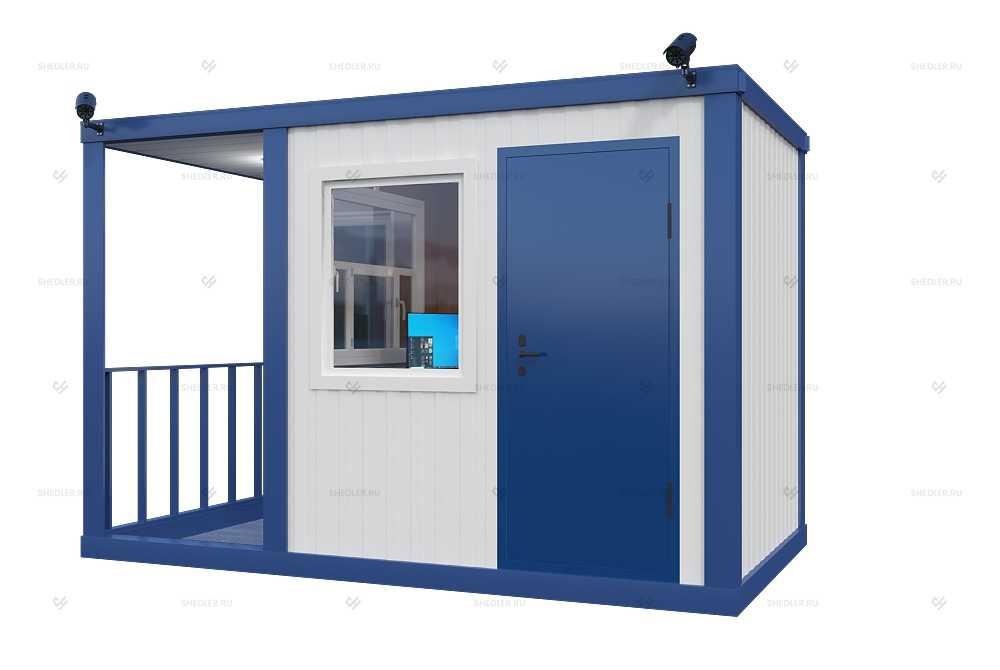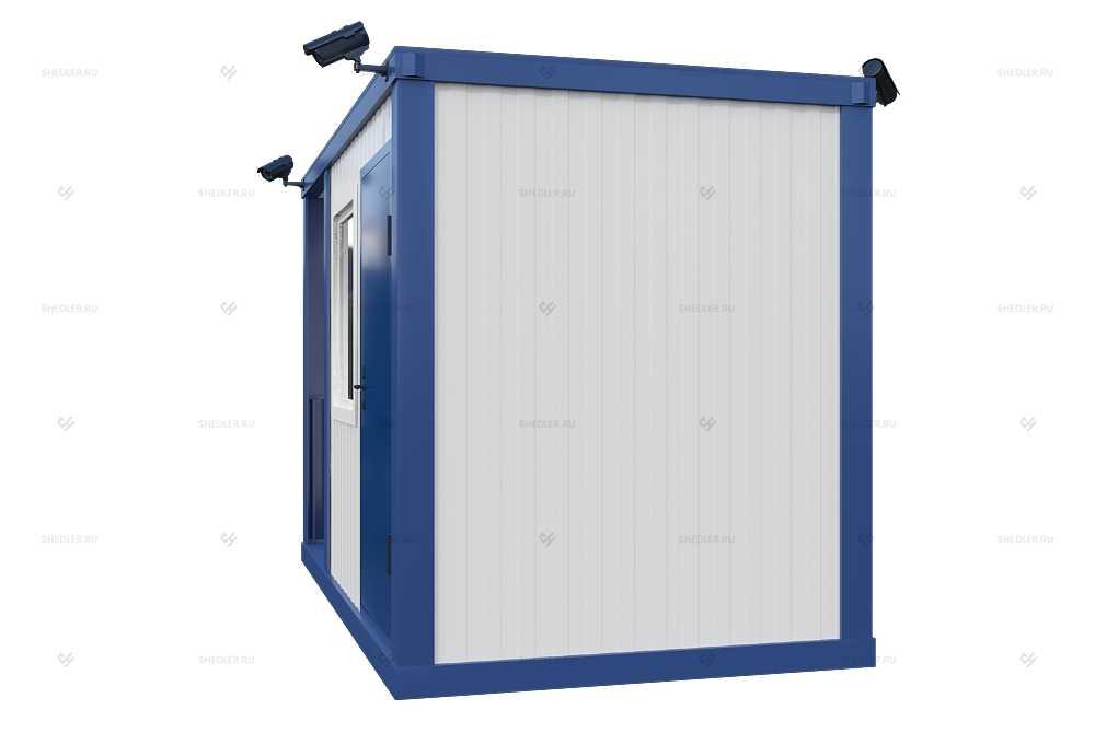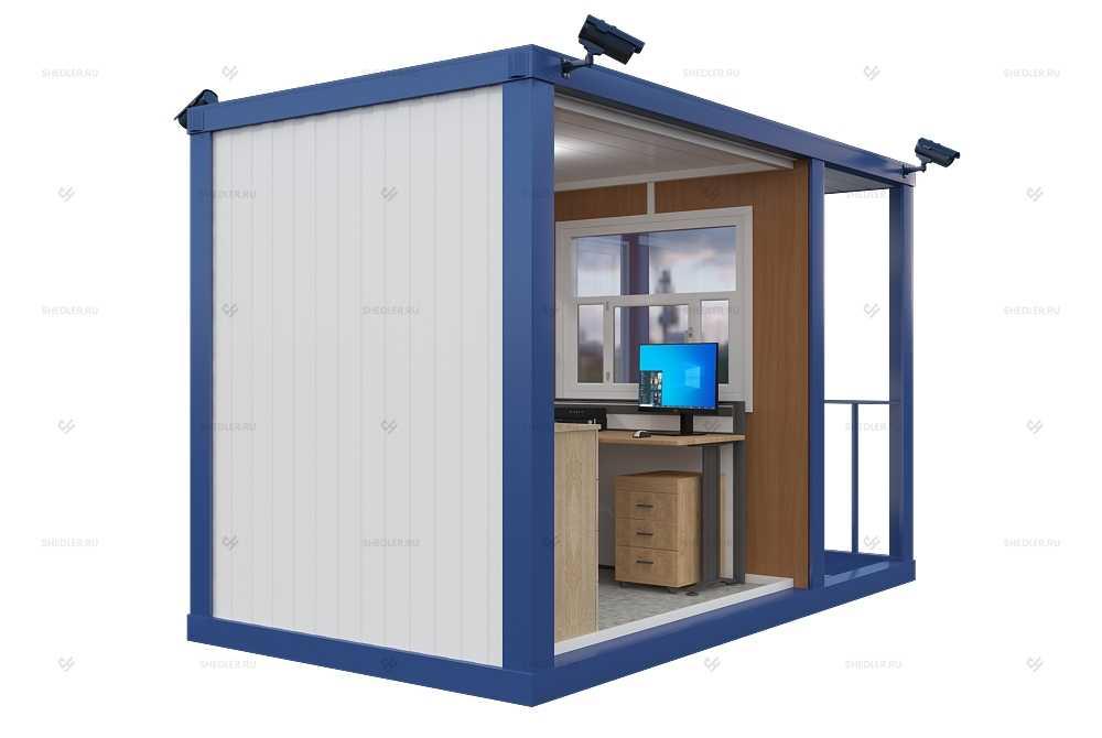 На входе установлена дверь из обшитой цветным железом ДВП с врезным замком. Проходная БП-028 SHEDLER хорошо адаптирована к любым условиям, переносит мороз до 45 градусов и жару до 50. Есть и другие преимущества: