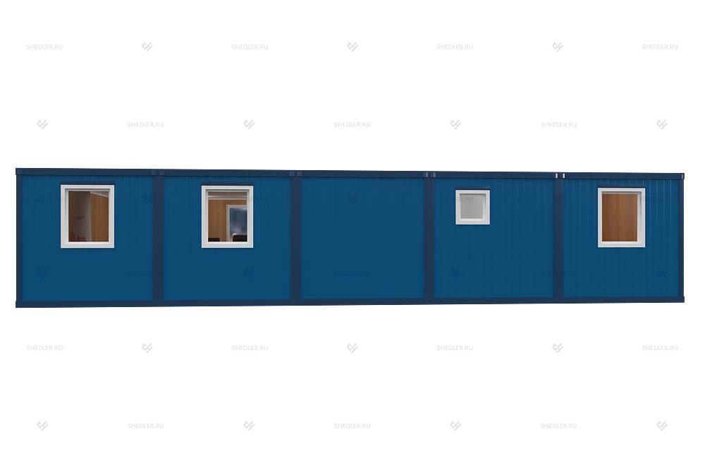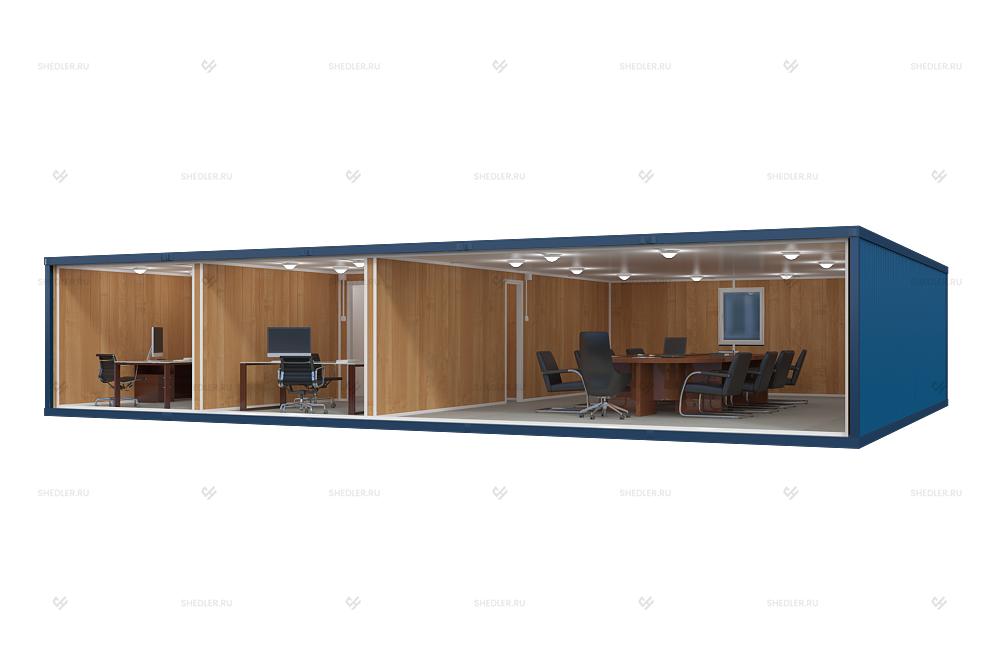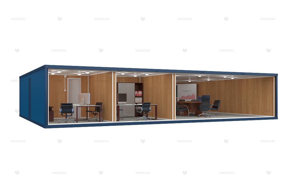 Быстровозводимое помещение блочно-модульного типа размером 12,25 х 9,0 х 2,45 м и площадью 110 кв.м предназначено для координации всех процессов, связанных с возведением промышленных и гражданских объектов. ШС-01 обеспечивает условия работы инженерно-технического персонала и руководства строительного объекта.