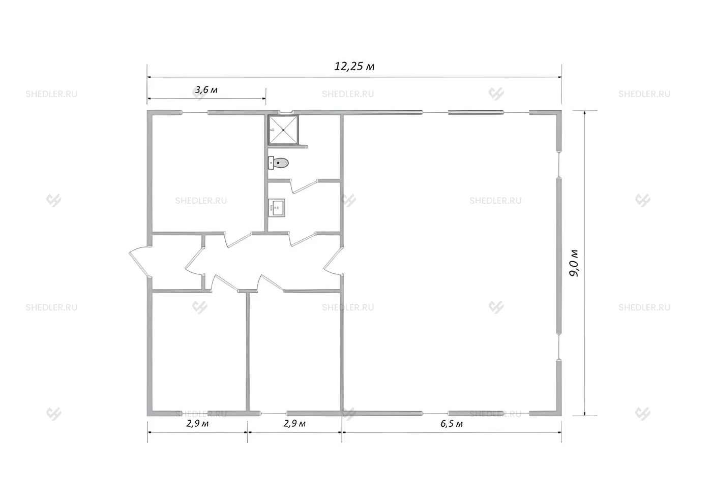 Основной элемент планировки – просторная и светлая комната переговоров. Помимо нее в проекте предусмотрены душевые и санузлы со всем необходимым набором сантехники. Внутреннее пространство разделено перегородками и 7 межкомнатными дверьми из МДФ, на входе установлена металлическая дверь российского производства с врезным замком.